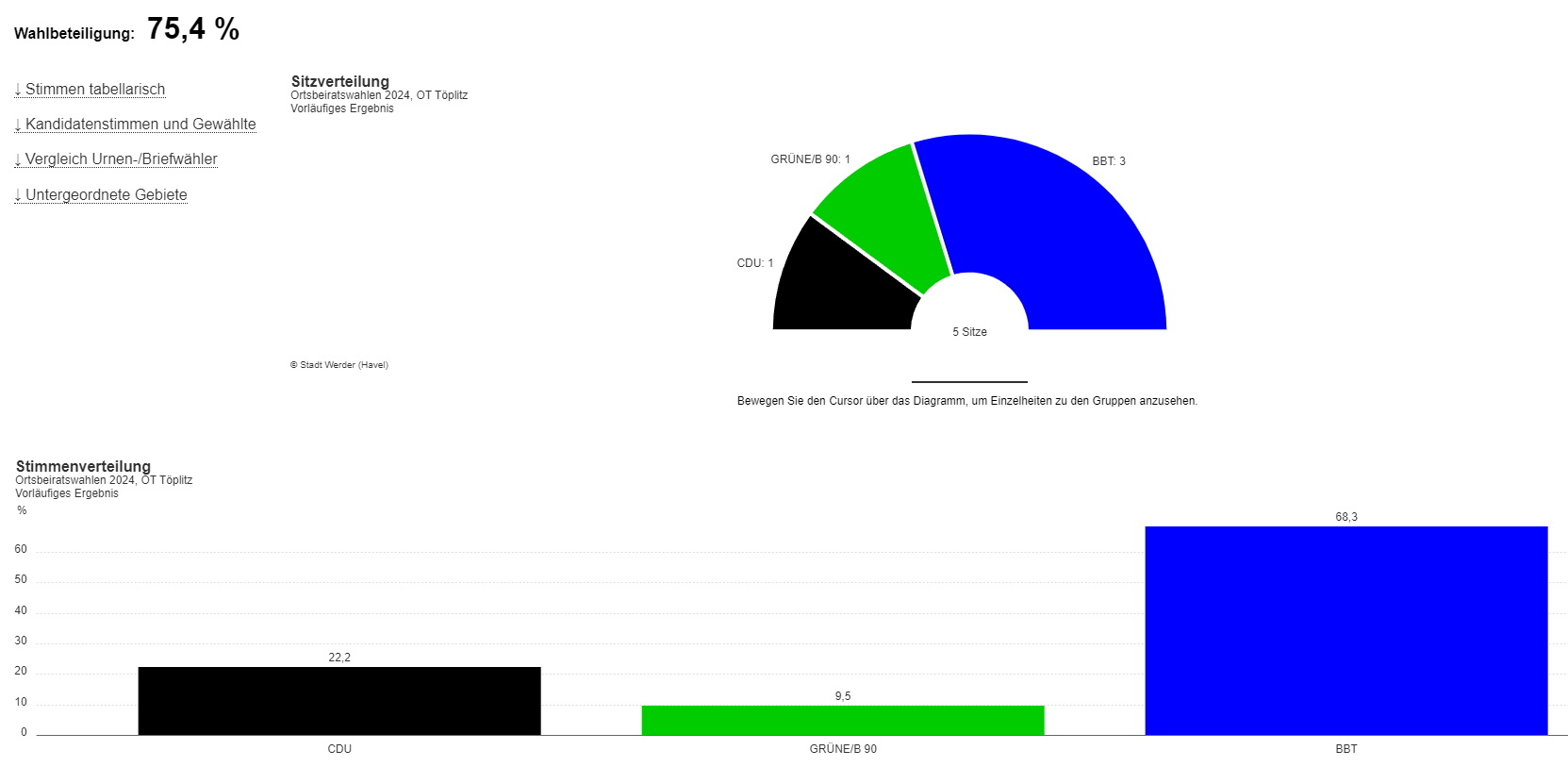 Verteilung der gültigen Stimmen auf die Bewerber - Wahl Ortsbeirat Töplitz und Stadtverordnetenversammlung Werder (Havel)